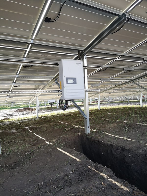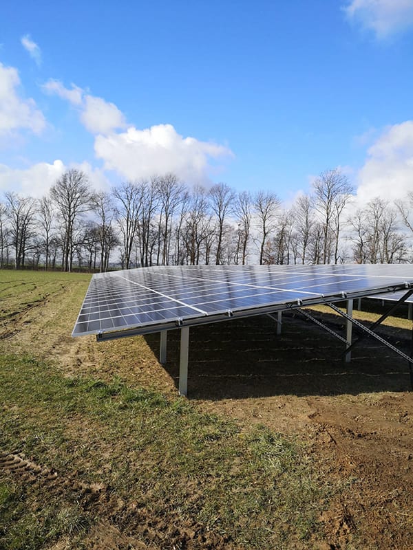 A tartóoszlopokat Gayk típusú vibroverő géppel telepítettük, amely gyors és hatékony földbe helyezést tesz lehetővé, még nehezebb talajviszonyok között is. A szerkezet elemei tűzihorganyzott acélból készülnek, a napelemek rögzítését pedig K2 Systems (Németország) alumínium bilinccsel oldottuk meg, amelyek pontos illeszkedést és hosszú élettartamot biztosítanak.